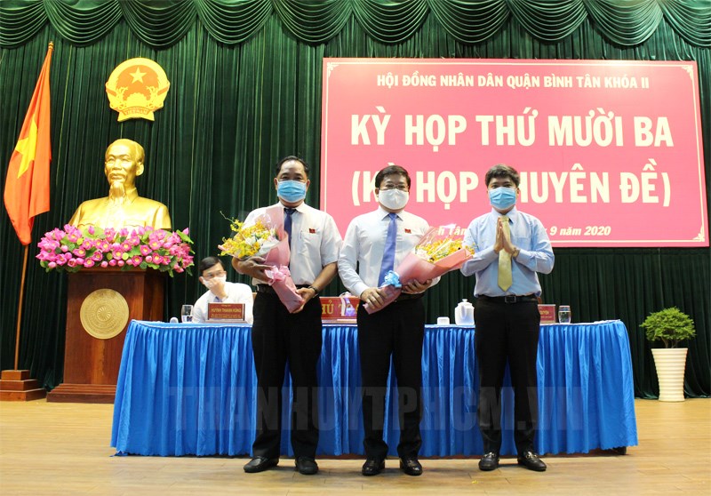 Đồng chí Lê Văn Thinh, Bí thư Quận ủy (giữa) được bầu làm Chủ tịch HĐND quận Bình Tân* Đồng chí Nguyễn Minh Nhựt được bầu chức danh Chủ tịch UBND quận Bình Tân nhiệm kỳ 2016-2021.