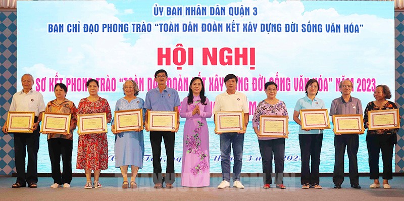 Phó Chủ tịch UBND Quận 3 Vũ Thị Mỹ Ngọc trao quà tri ân ban điều hành khu phốNăm 2024, Ban Chỉ đạo phong trào TDĐKXDĐSVH Quận 3 đề ra 10 chương trình công tác, với nội dung trọng tâm: tổ chức triển khai thực hiện có hiệu quả Phong trào TDĐKXDĐSVH trên địa bàn quận giai đoạn 2022 – 2026; tập trung đẩy mạnh phong trào xây dựng gia đình văn hóa, khu dân cư văn hóa, tiêu biểu; chú trọng tổ chức các hoạt động văn hóa, văn nghệ, thể dục thể thao quần chúng, nâng cao hiệu quả hoạt động của các thiết chế văn hóa, các câu lạc bộ văn hóa văn nghệ, thể dục thể thao, Tập trung hoàn thành đạt và vượt các chỉ tiêu, nhiệm vụ Nghị quyết Đại hội đại biểu Đảng bộ Quận 3 lần thứ XII đề ra.