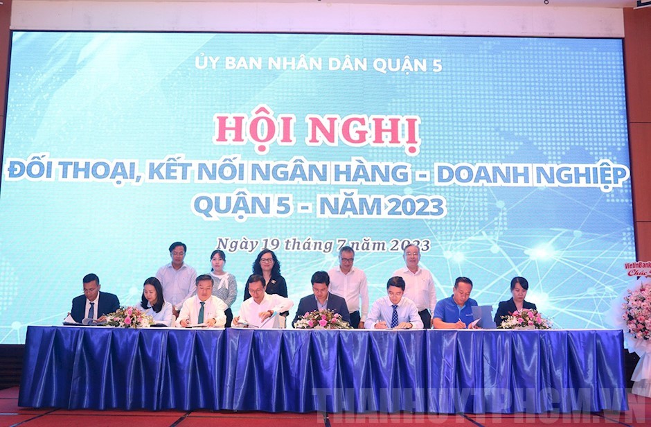 UBND Quận 5 tổ chức Ký kết các nội dung Chương trình kết nối Ngân hàng – Doanh nghiệp(Thanhuytphcm.vn) - Ngày 19/7, UBND Quận 5 tổ chức Hội nghị đối thoại, kết nối Ngân hàng - Doanh nghiệp trên địa bàn năm 2023 tại Khách sạn Equatorial, Phường 4.