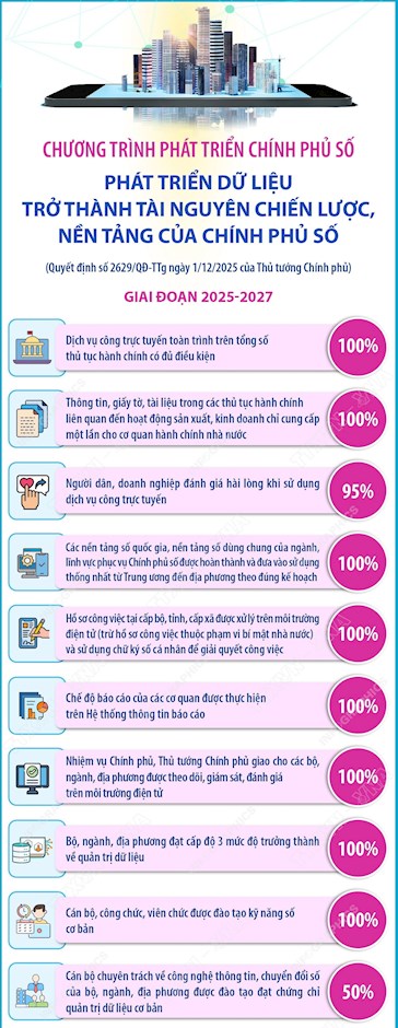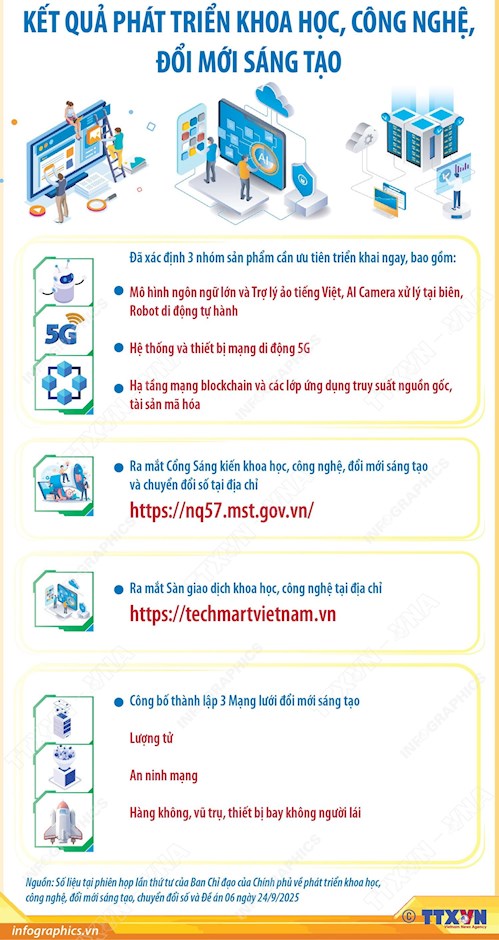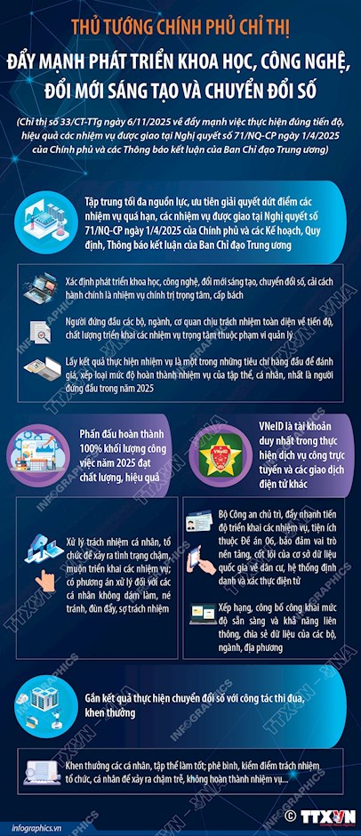 Cập nhật 09:16 10-11-2025Đẩy mạnh phát triển khoa học, công nghệ, đổi mới sáng tạo và chuyển đổi sốTại Chỉ thị số 33/CT-TTg ngày 6/11/2025 về đẩy mạnh việc thực hiện đúng tiến độ, hiệu quả các nhiệm vụ được giao tại Nghị quyết số 71/NQ-CP ngày 1/4/2025 của Chính phủ và các Thông báo kết luận của Ban Chỉ đạo Trung ương, Thủ tướng Chính phủ yêu cầu các bộ, cơ quan ngang bộ, cơ quan thuộc Chính phủ, Ủy ban Nhân dân các tỉnh, thành phố trực thuộc Trung ương cần tập trung tối đa nguồn lực để giải quyết dứt điểm các nhiệm vụ quá hạn; Phấn đấu hoàn thành 100% khối lượng công việc năm 2025 đạt chất lượng, hiệu quả; Bộ Công an chủ trì, đẩy nhanh tiến độ triển khai các nhiệm vụ, tiện ích thuộc Đề án 06, bảo đảm vai trò nền tảng, cốt lõi của cơ sở dữ liệu quốc gia về dân cư, hệ thống định danh và xác thực điện tử; hướng dẫn, đôn đốc các bộ, ngành, địa phương thực hiện việc chuyển đổi sang sử dụng VNeID là tài khoản duy nhất trong thực hiện dịch vụ công trực tuyến và các giao dịch điện tử khác; Gắn kết quả thực hiện chuyển đổi số với công tác thi đua, khen thưởng hằng năm một cách thực chất…
