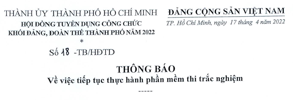 (Thanhuytphcm.vn) – Hội đồng tuyển dụng công chức khối Đảng, đoàn thể TPHCM năm 2022, ngày 15/4 vừa ban hành thông báo về việc triệu tập bổ sung thí sinh dự thi tuyển công chức khối Đảng, đoàn thể năm 2022.
