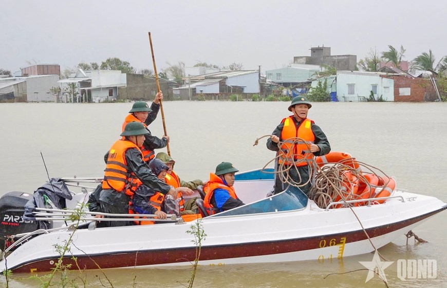 Cán bộ, chiến sĩ, học viên Trường Quân sự Quân đoàn 34 cứu dân ở thôn Diêu Trì (xã Tuy Phước, Gia Lai), ngày 19/11.Những ngày sau đó, trên địa bàn xã Ngô Mây (Gia Lai), mưa lũ tiếp tục diễn biến phức tạp. Cán bộ, chiến sĩ, học viên nhà trường lại hành quân đến với nhân dân, vừa di dời người dân đến nơi an toàn, vừa tổ chức vận chuyển hàng cứu trợ đến các điểm bị cô lập ở các thôn: Chánh Hội, Chánh Định, Vân Kim.