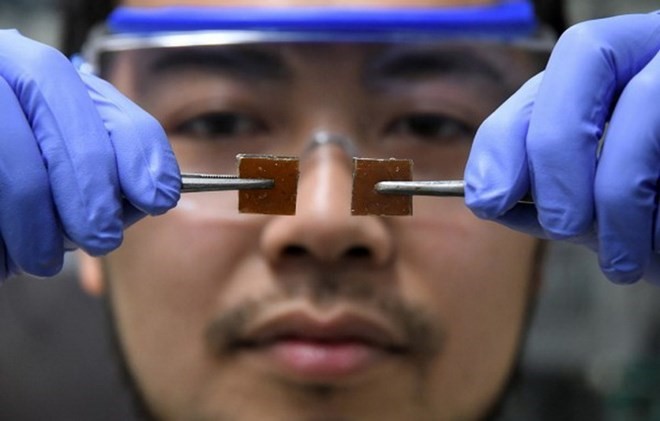 Nhà khoa học Yu Yanagisawa thí nghiệm ghép hai mảnh thủy tinh tự liền. (Nguồn: AFP/TTXVN)