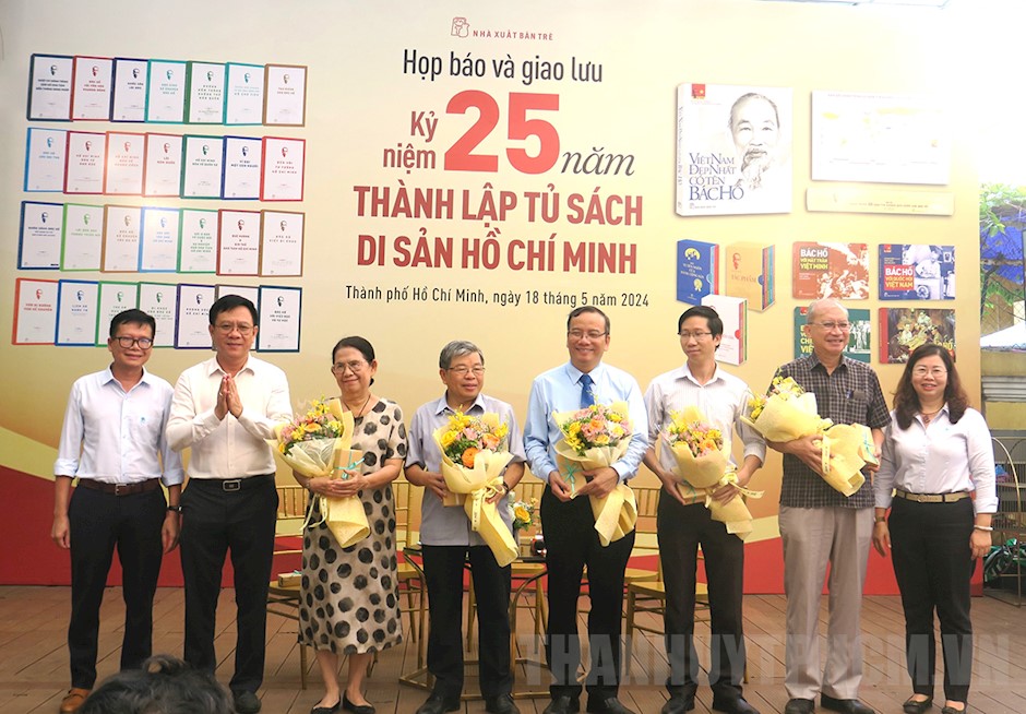 Phó Giám đốc Sở Thông tin và Truyền thông TP Nguyễn Ngọc Hồi và lãnh đạo Nhà Xuất bản Trẻ tặng hoa cảm ơn những người sáng lập và tác giả các tác phẩm trong bộ sách Di sản Hồ Chí Minh(Thanhuytphcm.vn) - Sáng 18/5, tại Đường sách TPHCM, Nhà xuất bản Trẻ tổ chức giao lưu cùng những người sáng lập và tác giả các tác phẩm trong bộ sách Di sản Hồ Chí Minh nhân kỷ niệm 134 năm ngày sinh Chủ tịch Hồ Chí Minh và kỷ niệm 25 năm thành lập Tủ sách Di sản Hồ Chí Minh.