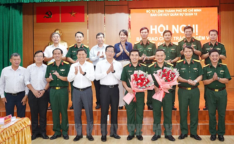 Đại tá Nguyễn Công Anh, Phó Chính ủy Bộ Tư lệnh TPHCM tặng hoa chúc mừng.(Thanhuytphcm.vn) - Chiều 27/6, Ban Chỉ huy Quân sự (CHQS) Quận 12 tổ chức hội nghị Bàn giao chức trách, nhiệm vụ Chính trị viên Ban Chỉ huy Quân sự Quận 12. Dự và chủ trì có Đại tá Nguyễn Công Anh, Phó Chính ủy Bộ Tư lệnh TPHCM; đồng chí Trần Hoàng Danh, Bí thư Quận ủy, Bí thư Đảng ủy Quân sự quận. Tham dự có thủ trưởng các cơ quan trực thuộc Bộ Tư lệnh TPHCM cùng các đồng chí trong Đảng ủy Quân sự quận.
