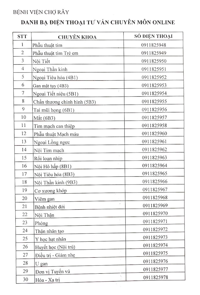 Những người có nhu cầu tư vấn khám bệnh online (không phải bệnh Covid-19), có thể liên hệ qua số điện thoại “đường dây nóng” của chuyên khoa cần khám. Với giải pháp mang tính thực tiễn này, Bệnh viện Chợ Rẫy hy vọng không chỉ những bệnh nhân Covid-19 mới được điều trị mà các bệnh nhân mắc bệnh lý khác vẫn được chăm sóc sức khỏe an toàn trong đợt dịch này.