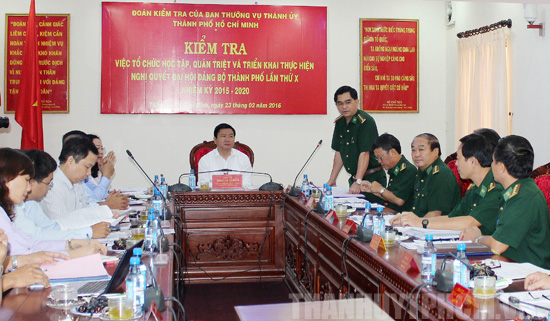 (Thanhuytphcm.vn) - Sáng 23/2, Đoàn công tác Thành ủy TPHCM do đồng chí Đinh La Thăng, Ủy viên Bộ Chính trị, Bí thư Thành ủy TPHCM làm trưởng đoàn, đã đến kiểm tra việc tổ chức học tập, quán triệt và triển khai thực hiện Nghị quyết Đại hội đại biểu Đảng bộ TP lần thứ X, nhiệm kỳ 2015-2020 tại Bộ đội Biên phòng TPHCM.