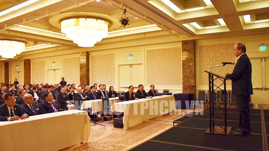 Phát biểu tại buổi gặp gỡ, Ủy viên Bộ Chính trị, Bí thư Thành ủy Nguyễn Thiện Nhân thông tin với bà con kiều bào một số điểm chính về môi trường đầu tư, tình hình tăng trưởng kinh tế- xã hội; việc triển khai đề án thành phố thông minh; phấn đấu cuối 2020 TPHCM sẽ có tuyến Metro đầu tiên…