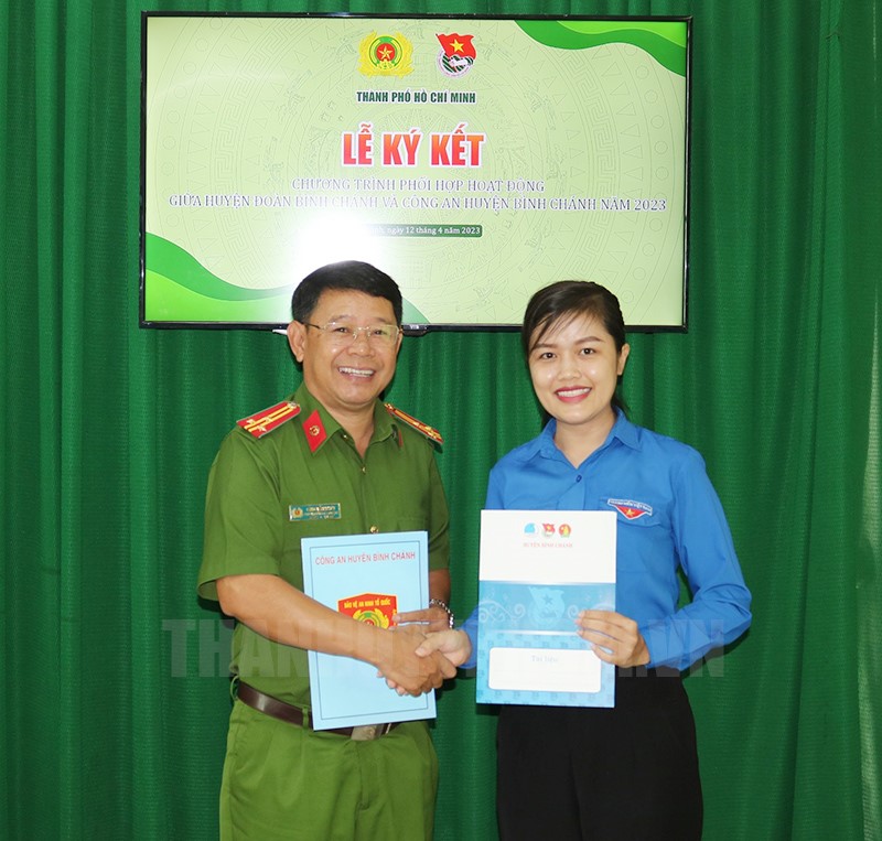 Huyện Đoàn và Công an Huyện Bình Chánh trao bản ký kết nội dung phối hợp hoạt động trong năm 2023(Thanhuytphcm.vn) - Chiều 12/4, Huyện Đoàn Bình Chánh phối hợp Công an Huyện tổ chức điểm cầu tiếp sóng chương trình Lễ ký kết Chương trình phối hợp hoạt động giữa Thành Đoàn và Công an Thành phố năm 2023. Đồng chí Thượng tá Tăng Văn Nhứt - Phó Trưởng Công an Huyện, đồng chí Đinh Thị Phương Thảo - Phó Bí thư Huyện Đoàn cùng đoàn viên thanh niên Công an Huyện tham dự.