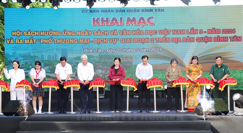 Đại biểu thực hiện nghi thức khai mạc.(Thanhuytphcm.vn) - Sáng 3/5, UBND quận Bình Tân tổ chức khai mạc Hội sách hưởng ứng Ngày sách và văn hóa đọc Việt Nam lần 3 năm 2024 và ra mắt “Phố Thương mại - dịch vụ” giai đoạn 2 trên địa bàn quận. Đến dự có các đồng chí: Lê Thị Ngọc Dung, Quận ủy viên, Phó Chủ tịch UBND quận.