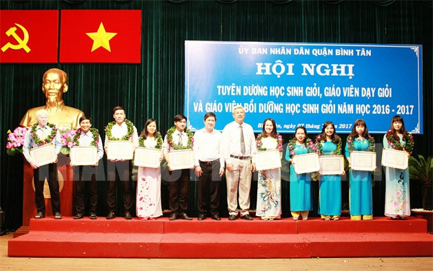 Tặng vòng hoa và Giấy khen của UBND quận cho các giáo viên dạy giỏi.(Thanhuytphcm.vn) - Sáng 7/7, UBND quận Bình Tân tổ chức Hội nghị tuyên dương học sinh giỏi, giáo viên dạy giỏi và giáo viên bồi dưỡng học sinh giỏi năm học 2016 - 2017.