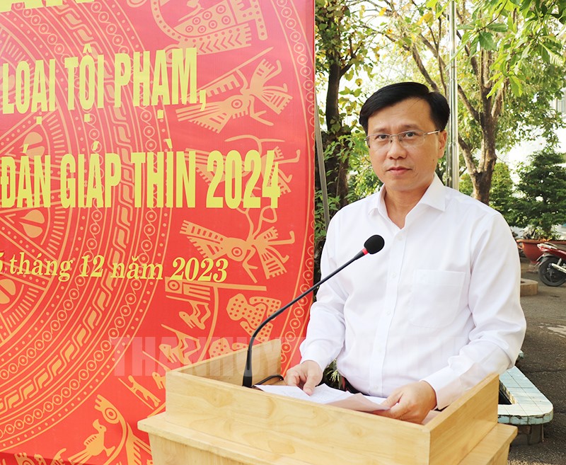 Chủ tịch UBND quận Nguyễn Minh Nhựt phát biểu chỉ đạo tại lễ ra quân.(Thanhuytphcm.vn) - Sáng 15/12, Công an quận Bình Tân tổ chức lễ ra quân cao điểm tấn công, trấn áp các loại tội phạm, bảo đảm an ninh, trật tự Tết Nguyên đán Giáp Thìn năm 2024. Đến dự có các đồng chí: Nguyễn Minh Nhựt, Phó Bí thư Quận ủy, Chủ tịch UBND quận; Lê Văn Bảy, Ủy viên Ban Thường vụ Quận ủy, Chủ tịch Ủy ban MTTQ Việt Nam quận; Đại tá Nguyễn Nhật Thành, Ủy viên Ban Thường vụ Quận ủy, Trưởng Công an quận.