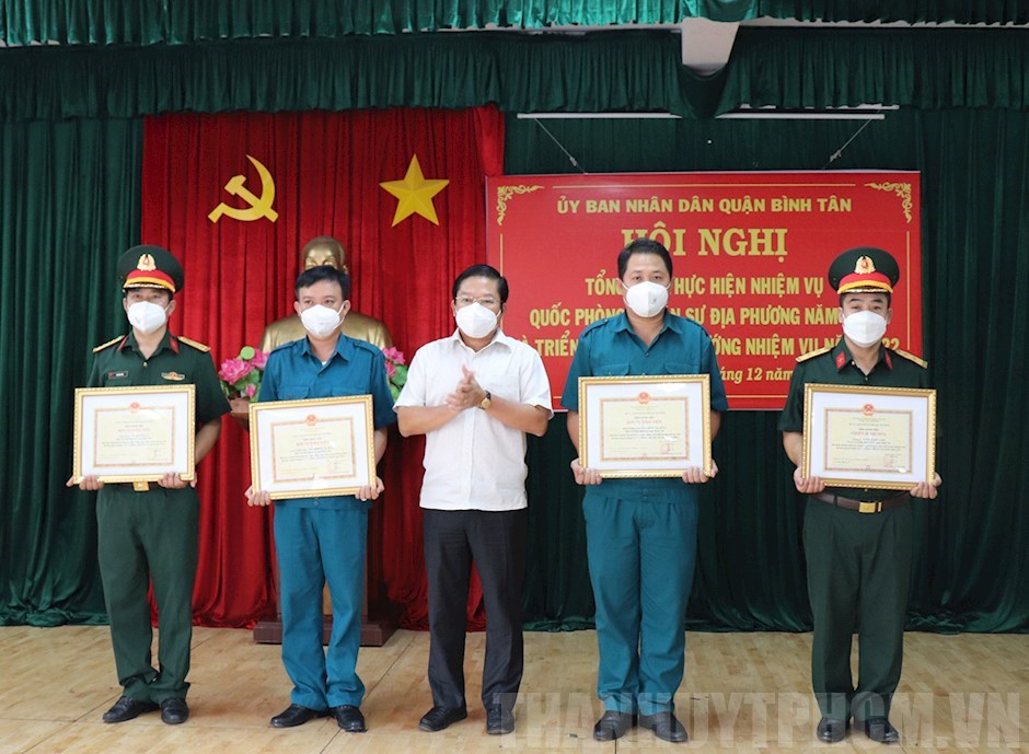 Dịp này, có 3 tập thể và 2 cán nhân nhận được giấy khen của Bộ Tư lệnh TPHCM; 8 tập thể và 40 cá nhân được UBND quận tuyên dương vì đã có thành tích xuất sắc trong công tác quân sự, quốc phòng địa phương năm 2021.