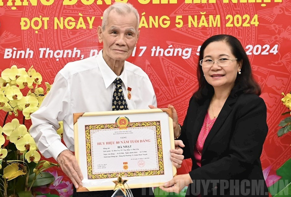 Chủ tịch HĐND TP Nguyễn Thị Lệ trao Huy hiệu Đảng cho đồng chí Hà Nhật(Thanhuytphcm.vn) - Chiều 17/5, Quận ủy quận Bình Thạnh tổ chức Lễ trao Huy hiệu 80 năm tuổi Đảng cho đồng chí Hà Nhật, đảng viên thuộc Đảng bộ Phường 15, quận Bình Thạnh. Đến dự có đồng chí Nguyễn Thị Lệ, Phó Bí thư Thành ủy, Chủ tịch HĐND TPHCM.