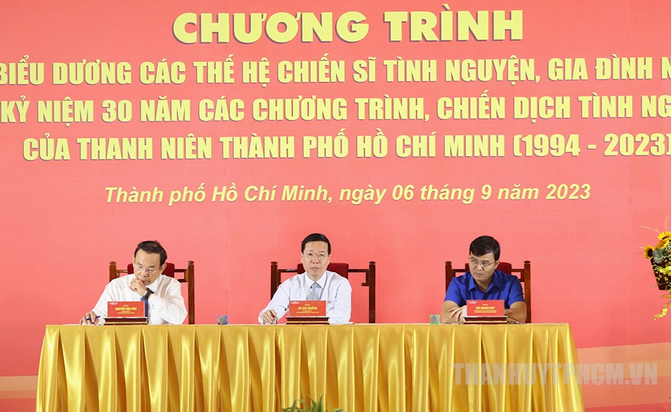 Chủ tịch nước Võ Văn Thưởng và các đồng chí lãnh đạo tham dự chủ trì chương trình(Thanhuytphcm.vn) - Sáng 6/9, tại TPHCM, Ủy viên Bộ Chính trị, Chủ tịch nước Võ Văn Thưởng dự Chương trình gặp gỡ và biểu dương các thế hệ chiến sĩ tình nguyện, gia đình nuôi tiêu biểu, nhân kỷ niệm 30 năm các chương trình, chiến dịch tình nguyện hè của thanh niên TPHCM (1994 - 2023).