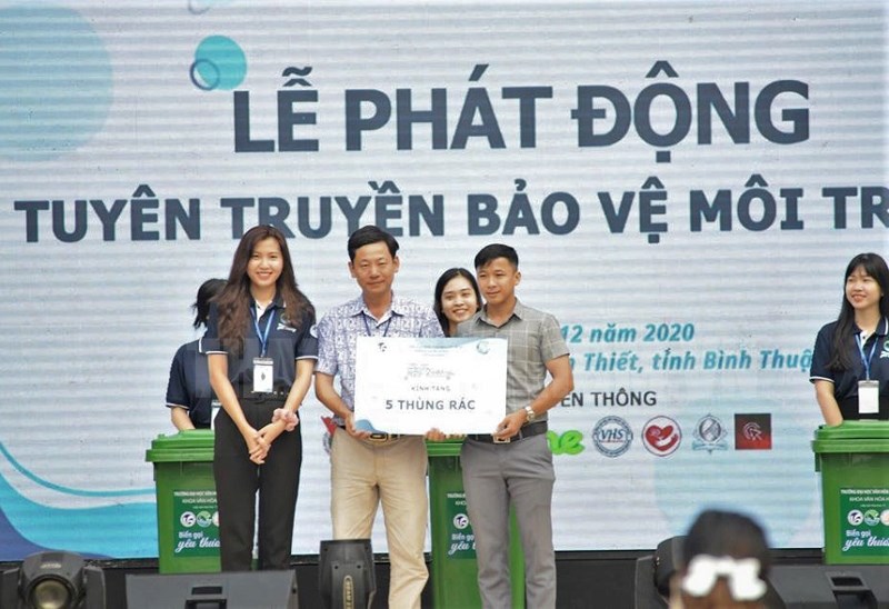 Bạn Bảo Ngân (bìa trái), Phó Ban tổ chức trao tặng biểu trưng và 5 thùng rác cho địa phương.(Thanhuytphcm.vn) - Sau 3 tháng chuẩn bị, con tàu “Biển gọi yêu thương” chuyên chở những thông điệp về bảo vệ môi trường biển đã cập bến thành công, để lại nhiều cảm xúc cho người dân các phường ven biển Mũi Né, Hàm Tiến, thành phố Phan Thiết, tỉnh Bình Thuận đặc biệt là hơn 1.000 học sinh và giáo viên của trường PTTH Bùi Thị Xuân cũng như thầy, trò trường Đại học Văn hóa TPHCM.