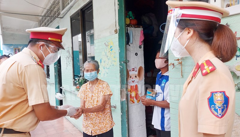 Công an Quận 3 trao quà cho người dân có hoàn cảnh khó khăn tại Trung tâm Bảo trợ dạy nghề và tạo việc làm cho người tàn tật TPHCM(Thanhuytphcm.vn) - Trong hai ngày 3 và 4/9, nhằm chia sẻ khó khăn với nhân dân trên địa bàn Quận 3, đặc biệt là các hộ nghèo, cận nghèo, hộ có hoàn cảnh khó khăn, những người bị ảnh hưởng trực tiếp bởi dịch Covid-19, Công an Quận 3 đã tổ chức trao tặng hơn 20 tấn lương thực, thực phẩm, nhu yếu phẩm (gạo, cá, rau củ quả, …) cho người dân - ảnh.