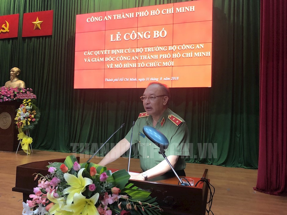 Phát biểu tại buổi lễ, Trung tướng Lê Đông Phong, Giám đốc Công an TP cho biết, Ban Giám đốc Công an TPHCM đặc biệt quan tâm triển khai thực hiện mô hình tổ chức mới theo chủ trương của Bộ Công an nhằm tiếp tục xây dựng lực lượng Công an TP có bản lĩnh chính trị vững vàng, chính quy, tinh nhuệ đảm bảo hoạt động hiệu lực hiệu quả. Ban Giám đốc Công an TP yêu cầu thủ trưởng, chỉ huy các đơn vị điều chỉnh quy chế làm việc cho phù hợp với tình hình thực tế; triển khai ngay các chỉ đạo của Ban Giám đốc, nhanh chóng bổ sung các nội dung mới vào chương trình công tác năm, triển khai ổn định nhiệm vụ công tác, không ngừng cải tiến công tác lãnh đạo, chỉ huy, quản lý điều hành. Đồng thời, tiếp tục nâng cao chất lượng, tập trung giải quyết những vấn đề trọng tâm, trọng điểm.