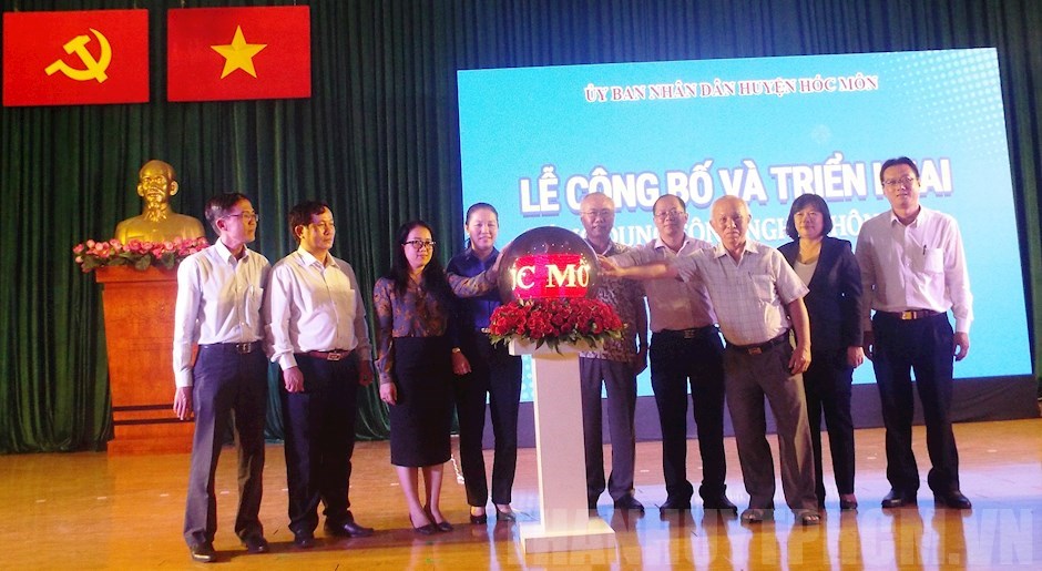 Các đại biểu thực hiện nghi thức kích hoạt hệ thống phần mềm “Ứng dụng công nghệ thông tin trên địa bàn huyện Hóc Môn”. (ảnh: Thy Dương)(Thanhuytphcm.vn) - Ngày 12/4, UBND huyện Hóc Môn đã tổ chức Lễ công bố và triển khai “Ứng dụng công nghệ thông tin trên địa bàn huyện Hóc Môn”.