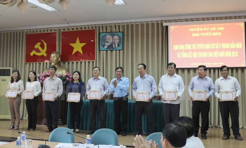 Đồng chí Huỳnh Văn Sơn, Trưởng Ban Tuyên giáo Huyện ủy tặng giấy khen cho cho các thí sinh đạt giải(Thanhuytphcm.vn) - Ngày 13/9, Ban Tuyên giáo Huyện ủy Củ Chi tổ chức Hội nghị sơ kết công tác tuyên giáo 9 tháng đầu năm, triển khai nhiệm vụ 3 tháng cuối năm 2018. Đồng chí Huỳnh Văn Sơn, Ủy viên Ban Thường vụ huyện ủy, Trưởng Ban Tuyên giáo Huyện ủy Củ Chi chủ trì hội nghị.
