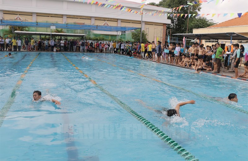 Các em học sinh tham gia kiểm tra bơi cự ly 50m.(Thanhuytphcm.vn) - Ngày 1/11, UBND huyện Củ Chi đã phát động toàn dân tập luyện môn bơi, phòng chống đuối nước năm 2020. Tham dự có hơn 500 học sinh, đoàn viên, cán bộ, công nhân và người dân trên địa bàn 21 xã, thị trấn.