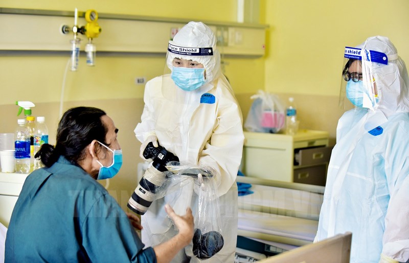 Công nhân vệ sinh thu gom, vận chuyển chất thải tại các cơ sở cách ly Covid-19. (Ảnh: TTXVN)Còn một sinh viên cũ của tôi hiện làm phóng viên ảnh ở một tờ báo thì kể việc bị chặn để kiểm tra giấy tờ do đi đêm hôm là chuyện bình thường nhưng vì có “giấy phép” nên các anh vui vẻ chào. Chỉ có điều công việc khiến cho em gần như quên ngày tháng, bởi có khi mới hơn 6 giờ đã có điện thoại gọi phải đến tác nghiệp khi thì bệnh viện dã chiến, khi thì khu phong tỏa…, lắm bữa đến quá nửa đêm mới về đến nhà. Lâu lâu “khoe hình” trên facebook thì chỉ nhìn thấy cái dáng, chứ mặt mũi và toàn thân kín mít trong trang phục bảo hộ.