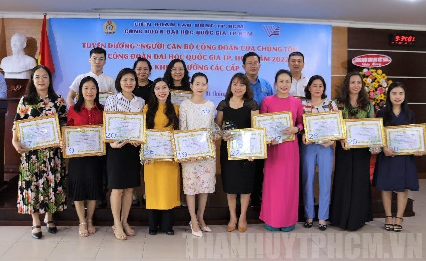 Dịp này, 7 cá nhận được nhận Kỷ niệm chương “Vì sự nghiệp xây dựng tổ chức Công đoàn” của Tổng liên đoàn Lao động Việt Nam. Ngoài ra, Công đoàn Đại học Quốc gia TPHCM cũng khen thưởng các tập thể, cá nhân tham gia, đạt thành tích cao và có nhiều đóng góp tại hội thi online “Tìm hiểu về công tác an toàn vệ sinh lao động” cấp TP năm 2022; Hội thi tuyên truyền viên giỏi năm 2022; Chương trình “1 triệu sáng kiến - nỗ lực vượt khó, sáng tạo, quyết tâm chiến thắng đại dịch Covid-19”; Chương trình “75 nghìn sáng kiến, vượt khó, phát triển”;...