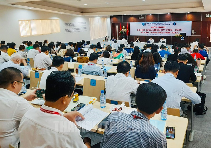 Quang cảnh Hội nghị(Thanhuytphcm.vn) - Ngày 23/6, Đảng ủy trường Đại học Quốc tế - Đại học Quốc gia TPHCM (ĐHQG - HCM) tổ chức Hội nghị sơ kết giữa nhiệm kỳ thực hiện Nghị quyết Đại hội đại biểu Đảng bộ trường nhiệm kỳ 2020 – 2025; và sơ kết 6 tháng đầu năm 2023. Tham dự Hội nghị có đồng chí Hồ Nhựt Quang, Bí thư Đảng ủy - Chủ tịch Hội đồng trường cùng đồng chí 120 đồng chí đảng viên của Đảng bộ Đại học Quốc tế.