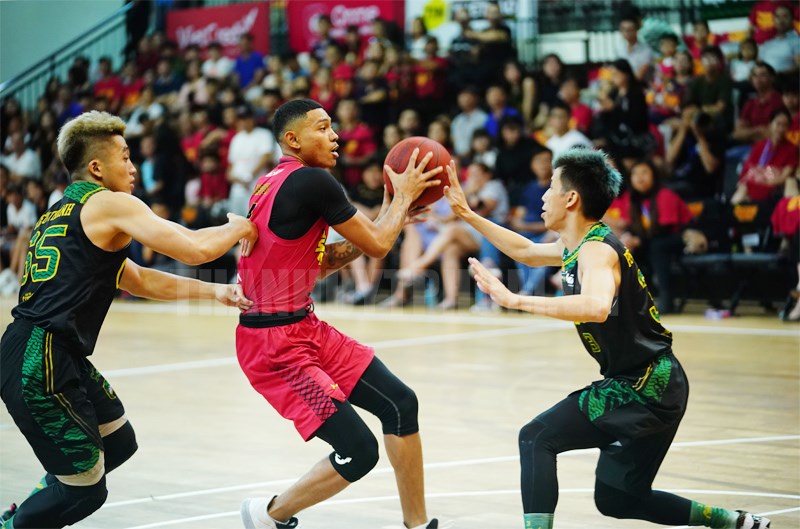 Cantho Catfish (áo xanh đen) một lần nữa vượt lên dẫn trước Saigon Heat ở loạt trận chung kết VBA(Thanhuytphcm.vn) - Tối 13/9, ở trận đấu thứ 3 thuộc loạt chung kết giải bóng rổ chuyên nghiệp Việt Nam VBA 2019, hai đội Saigon Heat và Cantho Catfish tiếp tục cống hiến cho người hâm mộ một màn thư hùng hấp dẫn.