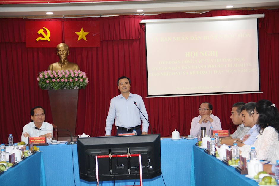 Báo cáo tại buổi làm việc, Phó Chủ tịch UBND huyện Hóc Môn Nguyễn Văn Tuyên đã thông tin kết quả thực hiện nhiệm vụ năm 2022; đồng thời nêu 4 nhiệm vụ và giải pháp trong năm 2023 huyện Hóc Môn sẽ tập trung thực hiện bao gồm: Triển khai đồng bộ, hiệu quả các hoạt động thực hiện chủ đề năm 2023 “Nâng cao hiệu quả hoạt động công vụ, đẩy mạnh cải cách hành chính và cải thiện môi trường đầu tư; thúc đẩy phát triển kinh tế, đảm bảo an sinh xã hội”; triển khai thực hiện tốt các nhiệm vụ, giải pháp trọng tâm phát triển kinh tế - văn hóa - xã hội, đảm bảo an sinh xã hội một cách đồng bộ, hiệu lực, hiệu quả; đảm bảo kỷ luật, kỷ cương đối với cán bộ, công chức trong thực thi công vụ; xử lý nghiêm cán bộ nhũng nhiễu, gây phiền hà cho người dân và doanh nghiệp;…
