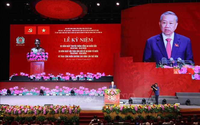 Một lần nữa, nhân dịp kỷ niệm 80 năm Ngày truyền thống Công an nhân dân và 20 năm Ngày hội Toàn dân bảo vệ an ninh Tổ quốc, thay mặt lãnh đạo Đảng và Nhà nước, tôi nhiệt liệt biểu dương, chúc mừng và tri ân những thành tích to lớn, chiến công hiển hách của lực lượng Công an nhân dân; chân thành cảm ơn sự quan tâm lãnh đạo, chỉ đạo của các cấp ủy, chính quyền; sự phối hợp chặt chẽ của các bộ, ngành, địa phương; sự ủng hộ quý báu, bền bỉ của Nhân dân cả nước và bạn bè quốc tế.