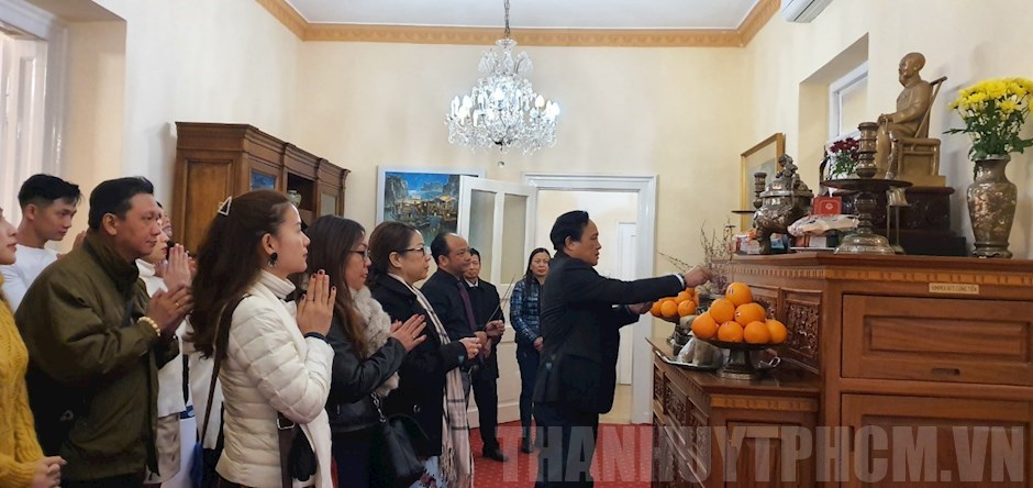 Đoàn Văn nghệ sĩ thắp hương tưởng nhớ Chủ tịch Hồ Chí Minh tại Đại sứ quán Hungary(Thanhuytphcm.vn) - Ngày 26/1 (mùng 2 Tết) đoàn công tác phục vụ văn nghệ kiều bào của TPHCM tại châu Âu do ông Phùng Công Dũng, Chủ nhiệm Ủy ban Người Việt Nam ở nước ngoài TPHCM dẫn đầu đã đến thăm và chúc Tết Đại sứ quán Việt Nam tại Hungary.