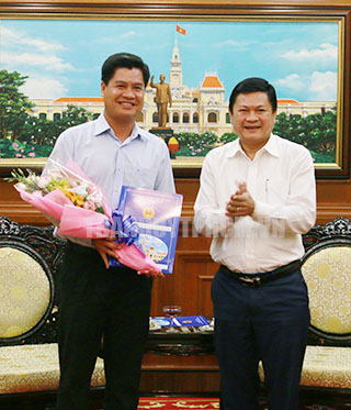 Phó Chủ tịch UBND TPHCM Huỳnh Cách Mạng trao quyết định cho đồng chí Lê Minh Khoa.
