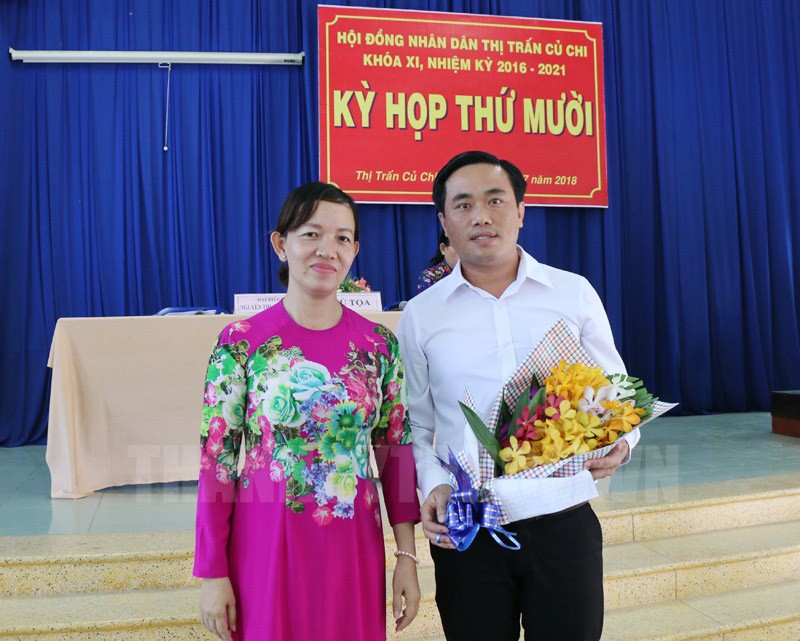 Đồng chí Nguyễn Thị Hằng, Bí thư Đảng ủy Thị trấn Củ Chi tặng hoa chúc mừng đồng chí Nguyễn Văn Dương, tân Chủ tịch UBND Thị trấn Củ Chi.(Thanhuytphcm.vn) - Ngày 5/7, tại Kỳ họp thứ mười HĐND Thị trấn Củ Chi khóa XI, nhiệm kỳ 2016 - 2021, 30/30 đại biểu HĐND Thị trấn Củ Chi đã bỏ phiếu bổ nhiệm chức danh Chủ tịch UBND Thị trấn Củ Chi đối với đồng chí Nguyễn Văn Dương, Phó Bí thư Đảng ủy Thị trấn Củ Chi.
