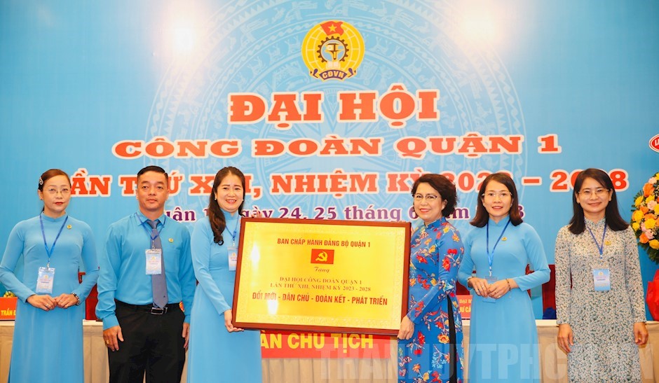 Dịp này, Ban Chấp hành Đảng bộ Quận 1 tặng bảng đồng cho Đại hội Công đoàn Quận 1 lần thứ XIII, nhiệm kỳ 2023 – 2028 với dòng chữ “Đổi mới - Dân chủ - Đoàn kết - Phát triển”.