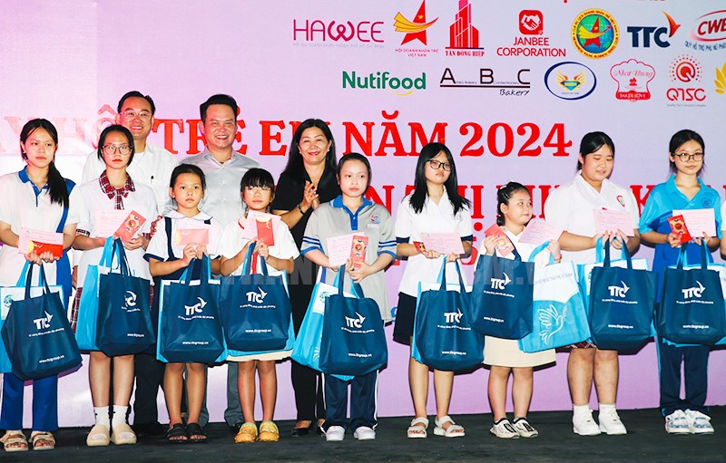 Đồng chí Đặng Hồng Anh và đồng chí Nguyễn Thị Bạch Mai trao học bổng cho các em học sinh.(Thanhuytphcm.vn) - Tối 28/8, Hội Liên hiệp Phụ nữ (LHPN) TPHCM phối hợp Hội Doanh nhân trẻ Việt Nam và Câu lạc bộ (CLB) Du lịch Doanh nhân trẻ Việt Nam tổ chức chương trình Ngày hội trẻ em năm 2024 và Lễ trao học bổng Nguyễn Thị Minh Khai năm học 2024 – 2025.