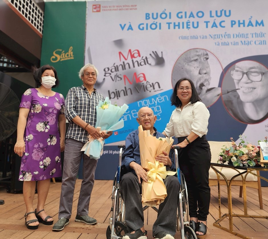 Nhà Xuất bản Tổng hợp TPHCM tặng hoa cho hai tác giả giao lưu tại chương trình(Thanhuytphcm.vn) - Trong khuôn khổ “Ngày sách và văn hóa đọc Việt Nam lần thứ 2 năm 2023”, sáng 20/4, Nhà xuất bản Tổng hợp TPHCM tổ chức buổi giao lưu, trò chuyện giới thiệu tác phẩm “Ma gánh hát v/s Ma bịnh viện” cùng hai tác giả Mạc Can và Nguyễn Đông Thức.