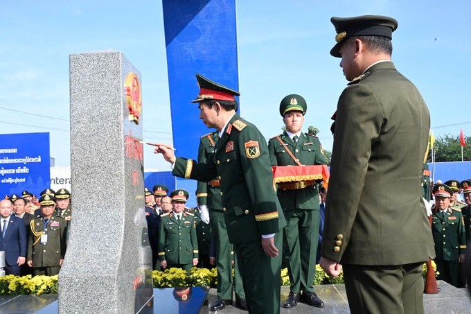 Đại tướng Phan Văn Giang thực hiện nghi thức tô son cột mốc chủ quyền phía Việt Nam