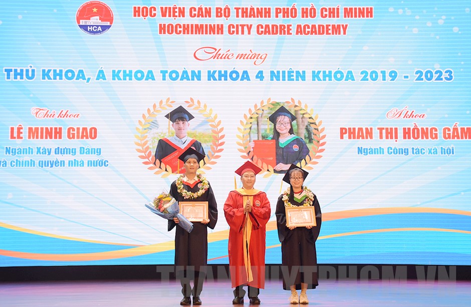 Tân cử nhân nhận bằng tốt nghiệp tại buổi lễTại buổi lễ, Học viện Cán bộ TP đã trao tặng Giấy khen cho 44 sinh viên tốt nghiệp loại Giỏi. Thủ khoa toàn Học viện là sinh viên Lê Minh Giao, khóa IV ngành Xây dựng đảng và chính quyền nhà nước với điểm trung bình toàn khóa là 8,57 điểm.