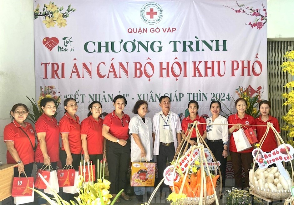 Phó Bí thư Thường trực Quận ủy Nguyễn Thị Thu Hoài cùng Chủ tịch Hội CTĐ quận Lê Thị Vịnh tặng quà và chúc Tết các cán bộ Hội CTĐ cơ sở(Thanhuytphcm.vn) - Ngày 30/1, Hội Chữ thập đỏ (CTĐ) quận Gò Vấp đã tổ chức họp mặt, chúc Tết cán bộ Hội cơ sở. Đồng chí Nguyễn Thị Thu Hoài, Phó Bí thư Thường trực Quận ủy, Chủ tịch danh dự Hội CTĐ quận đã đến dự và chúc tết cán bộ, hội viên.