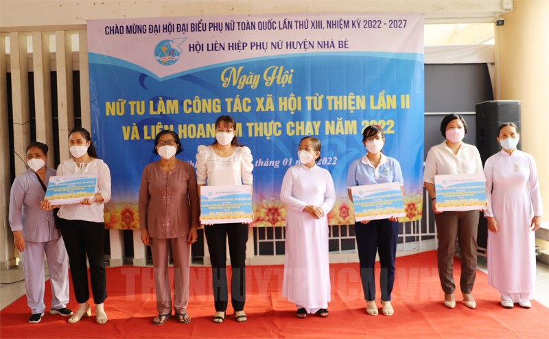 Đại diện các cơ sở tôn giáo trao tặng bảng tượng trưng 667 phần quà Tết cho Thường trực Hội LHPN xã, thị trấn(Thanhuytphcm.vn) - Chào mừng Đại hội đại biểu phụ nữ toàn quốc lần thứ XIII, nhiệm kỳ 2022 - 2027, sáng 17/1/2022, tại trường tiểu học Nguyễn Bình (cơ sở 2), Hội LHPN huyện Nhà Bè đã tổ chức Ngày hội nữ tu làm công tác xã hội từ thiện lần II và Liên hoan ẩm thực chay năm 2022.