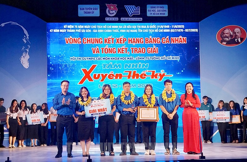 Đồng chí Nguyễn Thị Bạch Mai và đồng chí Nguyễn Tường Lâm trao giải nhất cho bảng đội tuyển(Thanhuytphcm.vn) – Tối 25/7, Thành Đoàn TPHCM phối hợp với Ban Tuyên giáo Thành ủy, Đại học Quốc gia TPHCM, Đảng ủy Khối Đại học, Cao đẳng TPHCM tổ chức Vòng Chung kết xếp hạng Bảng cá nhân và tổng kết, trao giải Hội thi Olympic các môn khoa học Mác - Lênin, Tư tưởng Hồ Chí Minh “Tầm nhìn xuyên thế kỷ” lần 12 - năm 2023.