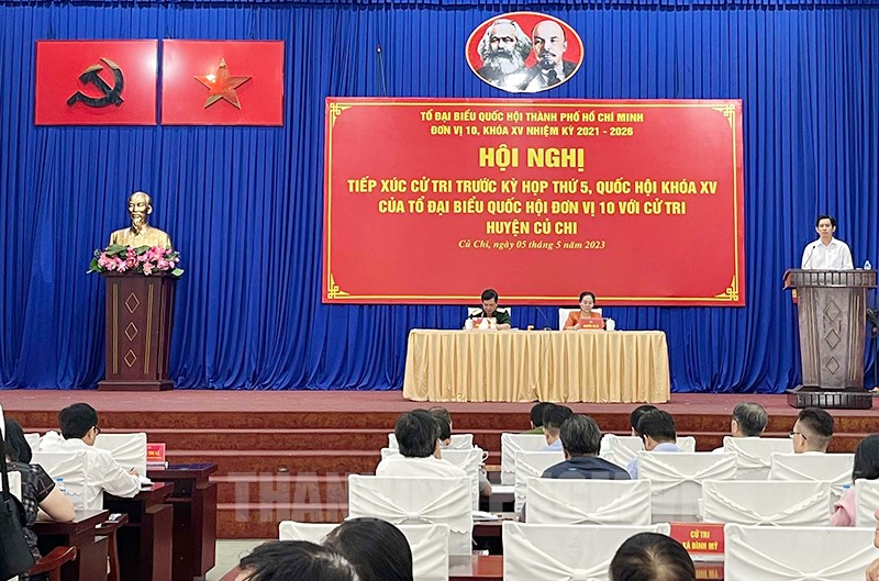 Các đại biểu tham dự buổi tiếp xúc cử tri.(Thanhuytphcm.vn) - Ngày 5/5, Tổ đại biểu Quốc hội TPHCM (đơn vị số 10) gồm các đại biểu: Nguyễn Thị Lệ, Phó Bí thư Thành ủy, Chủ tịch HĐND TPHCM; Thiếu tướng Phan Văn Xựng, Thành ủy viên Chính ủy Bộ Tư lệnh TPHCM đã có buổi tiếp xúc cử tri và cử tri là công nhân tại huyện Củ Chi trước kỳ họp thứ 5, Quốc hội khóa XV.