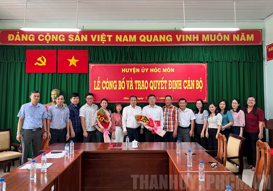 Phó Bí thư Thường trực Huyện ủy Nguyễn Anh Tuấn trao quyết định cho đồng chí Phan Hồng Minh và đồng chí Nguyễn Lê Trọng TâmTheo Quyết định số 6531/QĐ-UBND ngày 30/12/2022 của UBND huyện Hóc Môn, tiếp nhận đồng chí Nguyễn Lê Trọng Tâm, Chủ tịch UBND Thị trấn Hóc Môn vào làm công chức và điều động, bổ nhiệm giữ chức vụ Chánh Thanh tra huyện, thời hạn giữ chức vụ 5 năm, kể từ ngày 3/1/2023; Quyết định số 6533/QĐ-UBND ngày 30/12/2022 của UBND huyện Hóc Môn về tiếp nhận, điều động đồng chí Phan Hồng Minh, Phó Chánh Văn phòng Huyện ủy đến công tác tại UBND Thị trấn Hóc Môn, kể từ ngày 6/1/2023; Quyết định số 730-QĐ/HU ngày 3/1/2023 của Huyện ủy Hóc Môn chỉ định đồng chí Phan Hồng Minh, Phó Chánh Văn phòng Huyện ủy tham gia Ban Chấp hành Đảng bộ, Ban Thường vụ, giữ chức vụ Phó Bí thư Đảng ủy Thị trấn Hóc Môn nhiệm kỳ 2020 – 2025.