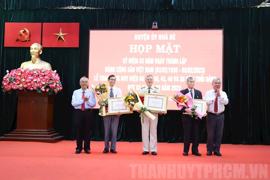 Đồng chí Dương Thế Trung và đồng chí Phạm Minh Huấn trao Huy hiệu 60 năm và 55 năm tuổi Đảng cho các đồng chí đảng viên(Thanhuytphcm.vn) - Ngày 2/2, Huyện ủy huyện Nhà Bè đã tổ chức họp mặt kỷ niệm 93 năm Ngày thành lập Đảng Cộng sản Việt Nam (3/2/1930 - 3/2/2023) và trao tặng Huy hiệu Đảng đợt 3 tháng 2 năm 2023. Đến dự có các đồng chí: Dương Thế Trung, Bí thư Huyện ủy huyện Nhà Bè; Phạm Minh Huấn, Phó Bí thư Thường trực Huyện ủy, Chủ tịch Hội đồng Nhân dân huyện Nhà Bè; Triệu Đỗ Hồng Phước, Phó Bí thư Huyện ủy, Chủ tịch Ủy ban nhân dân huyện Nhà Bè…