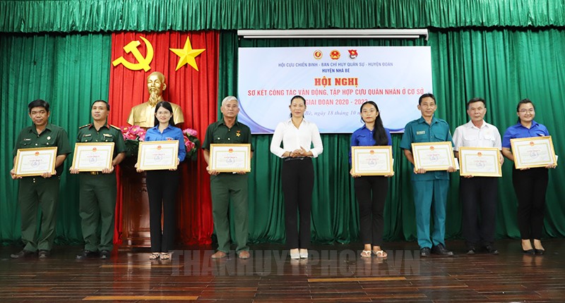 Đồng chí Trương Kim An trao khen thưởng cho các tập thể(Thanhuytphcm.vn) - Chiều 18/10, Hội Cựu ciến binh - Ban Chỉ huy Quân sự - Huyện đoàn huyện Nhà Bè đã tổ chức Hội nghị sơ kết công tác vận động, tập hợp cựu quân nhân ở cơ sở giai đoạn 2020 - 2023. Đến dự có Đại tá Nguyễn Thanh Phong, Phó Chủ nhiệm Chính trị Bộ Tư lệnh TPHCM; Ủy viên Ban Thường vụ Huyện ủy, Trưởng Ban Dân vận Huyện ủy, Chủ tịch Ủy ban Mặt trận Tổ quốc Việt Nam huyện Nhà Bè Trương Kim An...