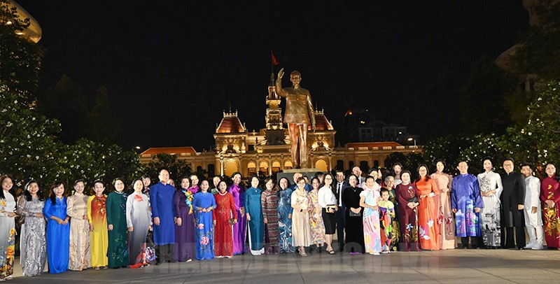 Các đại biểu chụp hình lưu niệm tại Tượng đài Chủ tịch Hồ Chí Minh trước khi tham dự khai mạc Lễ hội Áo dài TPHCM. (Ảnh: Quốc Thanh)(Thanhuytphcm.vn) – Tối 3/3, Lễ hội Áo dài TPHCM lần thứ 9 năm 2023 với chủ đề “Tôi yêu áo dài Việt Nam” đã khai mạc tại Phố đi bộ Nguyễn Huệ - Quận 1.