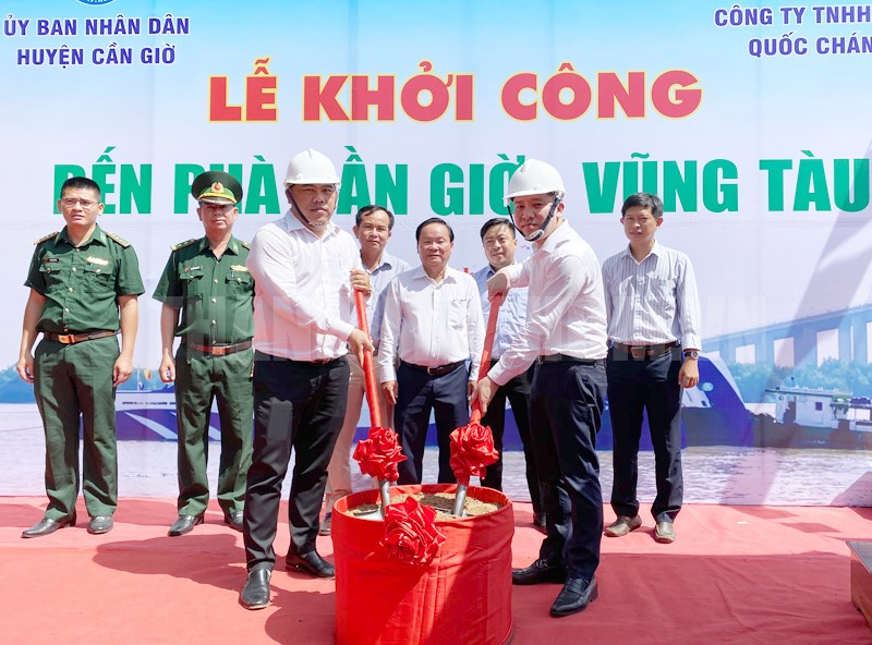 Các đại biểu thực hiện nghi thức khởi công phà Cần Giờ - Vũng Tàu.(Thanhuytphcm.vn) - Ngày 8/5, tại thị trấn Cần Thạnh, huyện Cần Giờ, Công ty TNHH MTV Quốc Chánh (chủ đầu tư) tổ chức Lễ khởi công xây dựng bến phà Cần Giờ - Vũng Tàu.
