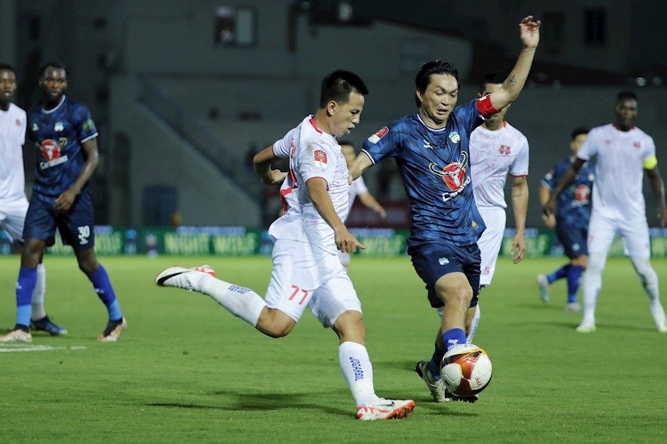 Hải Phòng (áo trắng) và HA.GL bất phân thắng baị ở trận ra quân. Ảnh: Minh Hoàng(Thanhuytphcm.vn) - V-League 2023/24 đã chính thức khởi động vào tối 20/10 trên sân Lạch Tray bằng cuộc so tài giữa đội chủ nhà Hải Phòng và HA.GL. Trận đấu kết thúc với tỷ số 1-1, kết quả được xem là may mắn cho đội khách khi họ tìm được bàn gỡ hòa vào cuối trận.