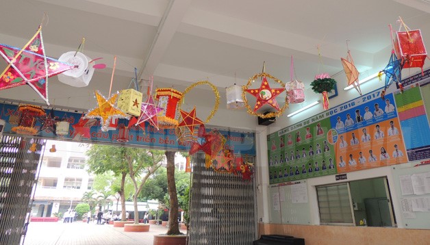 Lối vào trường được trưng bày các lồng đèn do học sinh vừa hoàn thành
